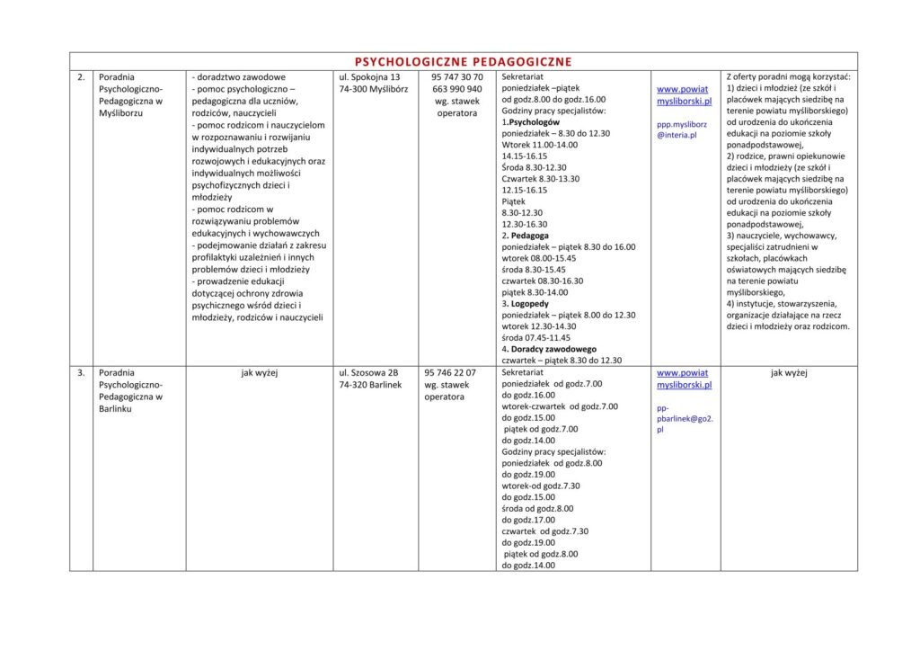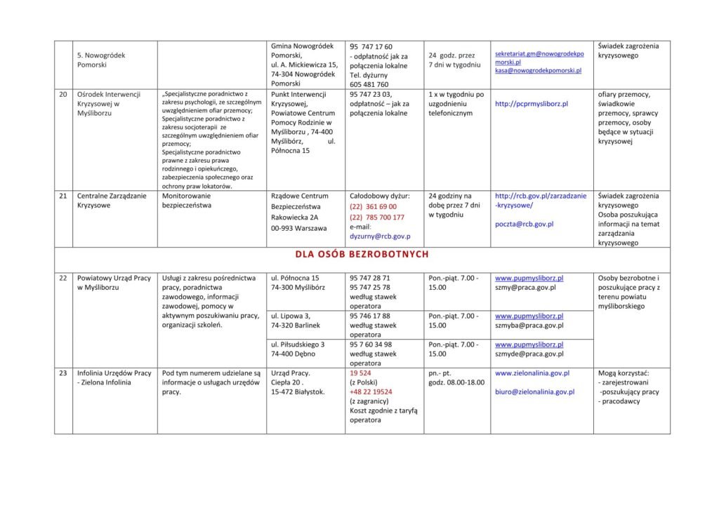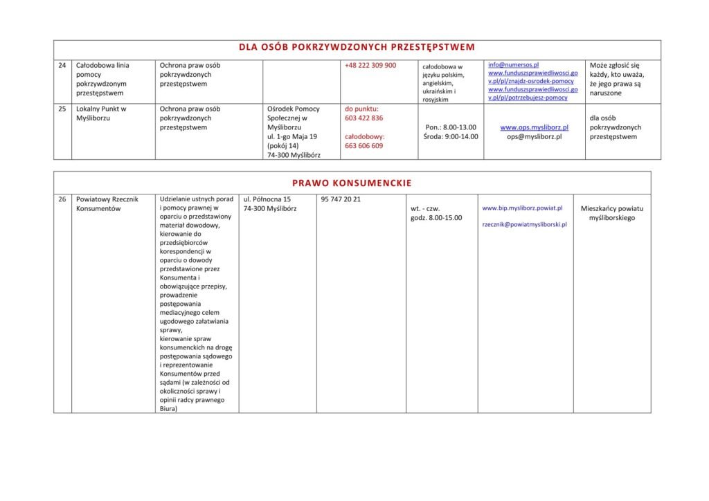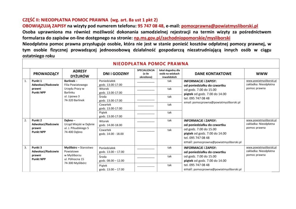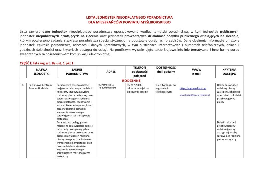 LISTA JEDNOSTEK NIEODPŁATNEGO PORADNICTWA DLA MIESZKAŃCÓW POWIATU MYŚLIBORSKIEGO